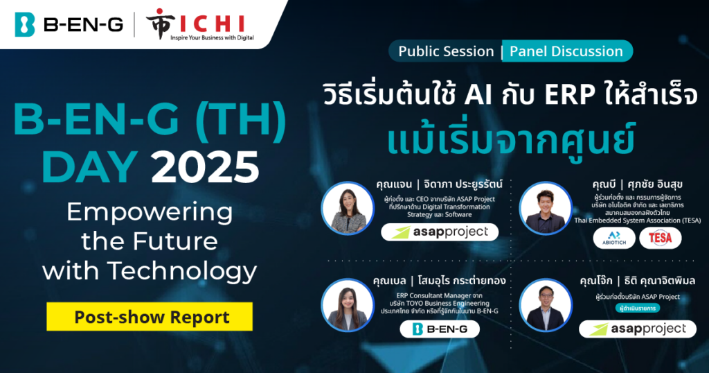 และปิดท้ายด้วยคุณเบล จาก B-EN-G โดยเธอกล่าวในฐานะผู้ให้บริการโซลูชัน ERP องค์กรมุ่งพัฒนาซอฟต์แวร์ที่ยกระดับประสิทธิภาพการทำงานของลูกค้าให้สูงสุด ผ่านแนวคิด mcframe AI Agent ที่มีเป้าหมายแปลงความรู้จากคน (Human Wisdom) ให้กลายเป็นข้อมูล เพื่อใช้ร่วมกันและต่อยอดสู่การสร้างคุณค่าทางธุรกิจร่วมกัน (Co-Creation) บนแพลตฟอร์ม mcframe Data-Centric Platform ซึ่งประกอบด้วย AI, Scenario Library, Process Workflow, Data Pipeline และ API Base ที่เชื่อมต่อข้อมูลได้อย่างต่อเนื่องและปลอดภัย เธอสรุปว่า การเริ่มต้น Implement ระบบกับผู้ให้บริการที่มีประสบการณ์และเข้าใจเทคโนโลยีเชิงลึก จะช่วยให้องค์กรก้าวสู่การเปลี่ยนผ่านสู่ยุค AI ได้อย่างมั่นใจและยั่งยืน