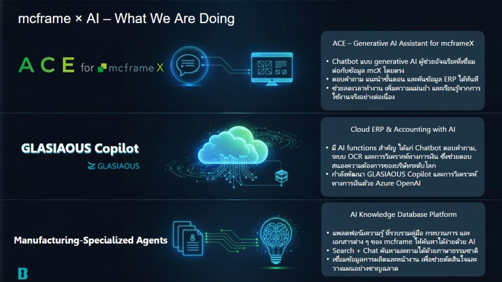 สำหรับความตั้งใจของ B-EN-G นั้นวาง Road map ไว้ว่า จะพัฒนาต่อยอดแพลตฟอร์ม mcframe AI Agent ที่ไม่ใช่เป็นแค่ระบบเทคโนโลยี แต่จะเป็นผู้ช่วย หรือ AI partner ขององค์กร ที่จะช่วยให้ผู้ใช้งาน ทำงานได้สะดวกขึ้น ช่วยวิเคราะห์ข้อมูล แนะนำแนวทางการตัดสินใจให้กับผู้ใช้งานได้อย่างแม่นยำ