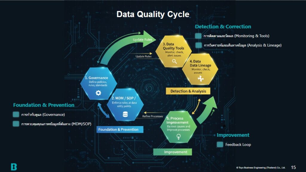 ควรเริ่มจากการสร้างรากฐานข้อมูลที่ดี คือข้อมูลที่สะอาดและมีคุณภาพ (Data Quality) ซึ่งคุณชลธิชาอธิบายว่า เป็นพื้นฐานสำคัญของการทำงานร่วมกับ AI และเพื่อให้คุณภาพข้อมูลคงอยู่ต่อเนื่อง องค์กรควรเข้าใจและนำแนวคิดวงจรคุณภาพข้อมูล มาใช้ในการสร้างข้อมูลที่ดีดังต่อไปนี้
